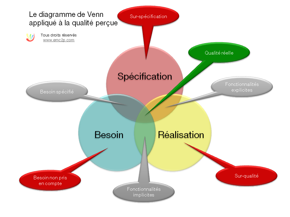 A titre d’exemple, la figure ci-dessous, illustre la relation qui existe entre un besoin, sa spécification et le produit livré.diagramme_de_vennUne telle représentation permet de clarifier la perception de chaque partie prenante dans l’analyse d’une situation, tout en fournissant les principaux domaines d’action pour la définition d’un plan d’action.